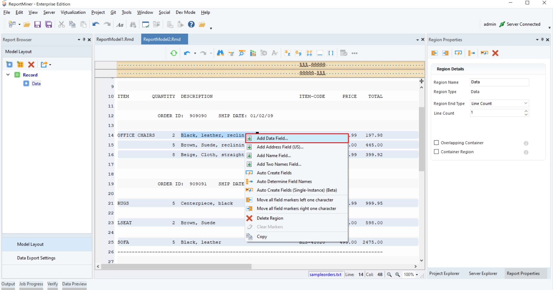 Right-click on the Record node in Model layout under the Report Browser panel and select Add Data Region from the context menu.