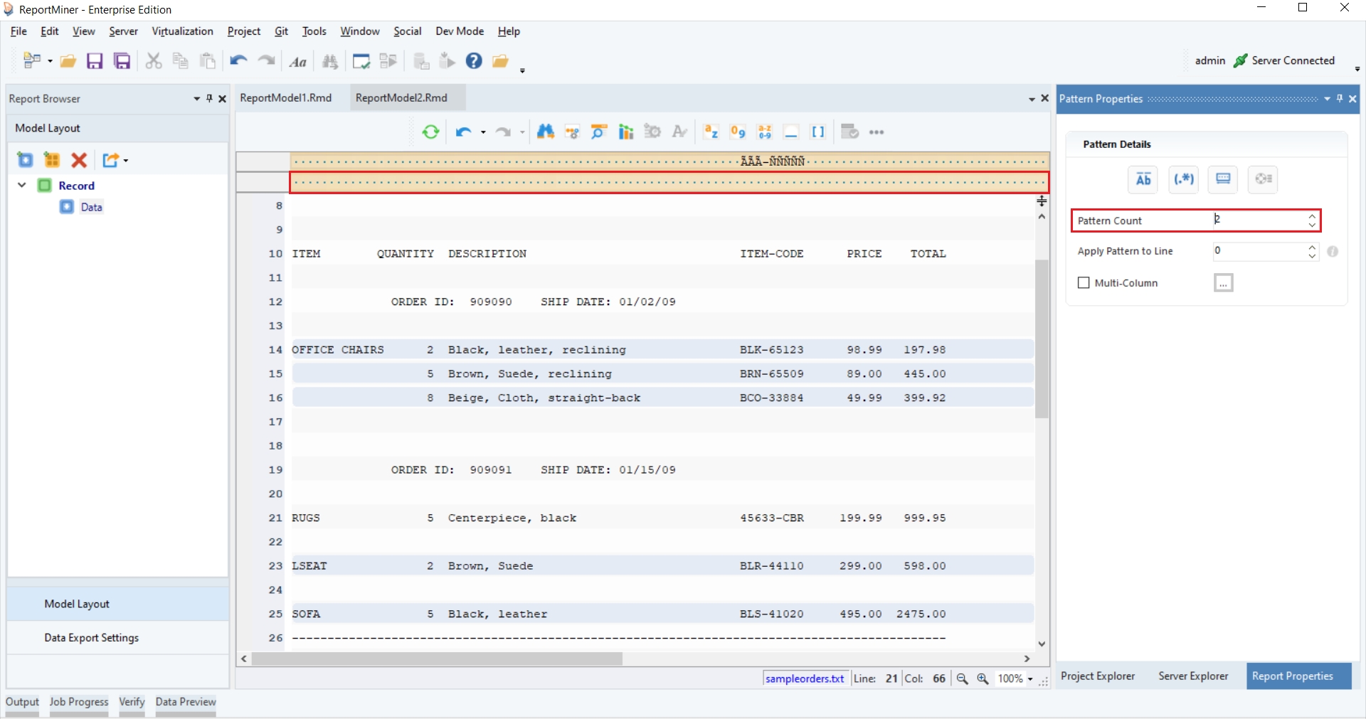 Pattern Count is the number of patterns that Astera matches on your file to capture a data region. This is useful if more than one pattern is required to identify the beginning of your data region. You can specify up to five patterns in a report model at a time.