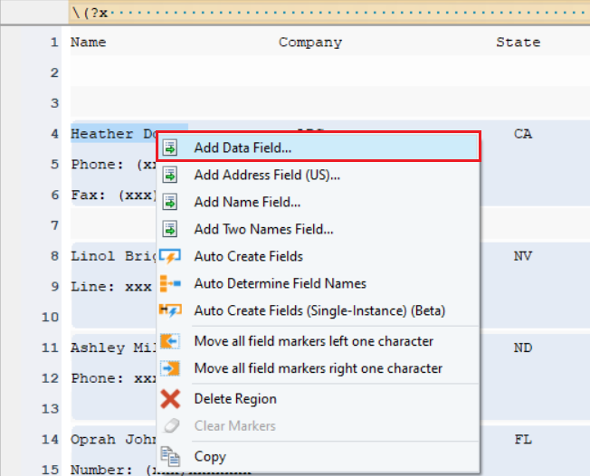 Here, we want to capture the information including name, company, and state of these dealers along with their phone and fax numbers. Notice that the information in the phone and fax fields is written in a different format than the rest of the data on this file. In order to capture this information, we will use the Pattern is a Regular Expression feature.
