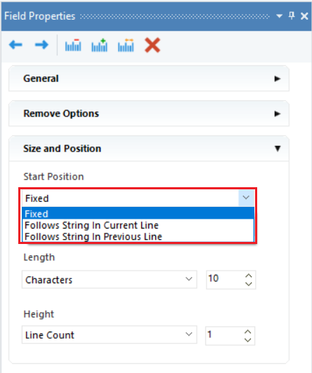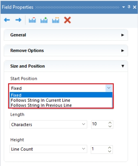 In Astera, you can manually specify the start position of a selected data field in the Field Properties panel. There are three options available in the drop-down menu to specify the Start Position, as shown below.