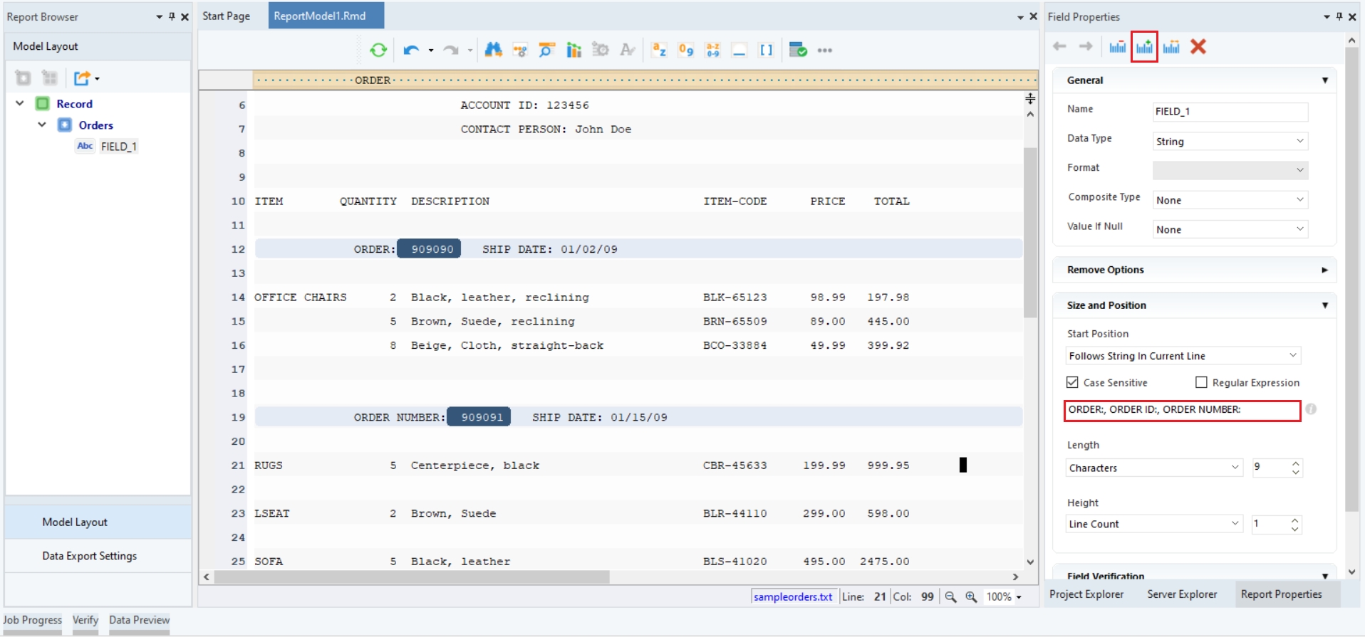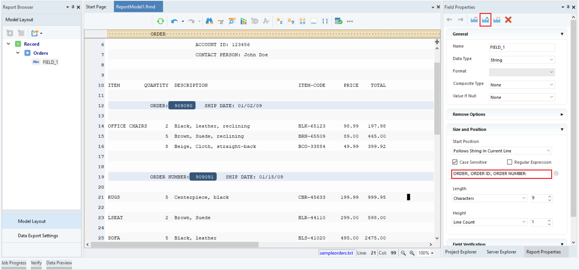2. Create the data region to capture the field containing the order number by defining an appropriate pattern. Define the pattern as 'ORDER' and rename the data region to Orders in the Region Properties panel.