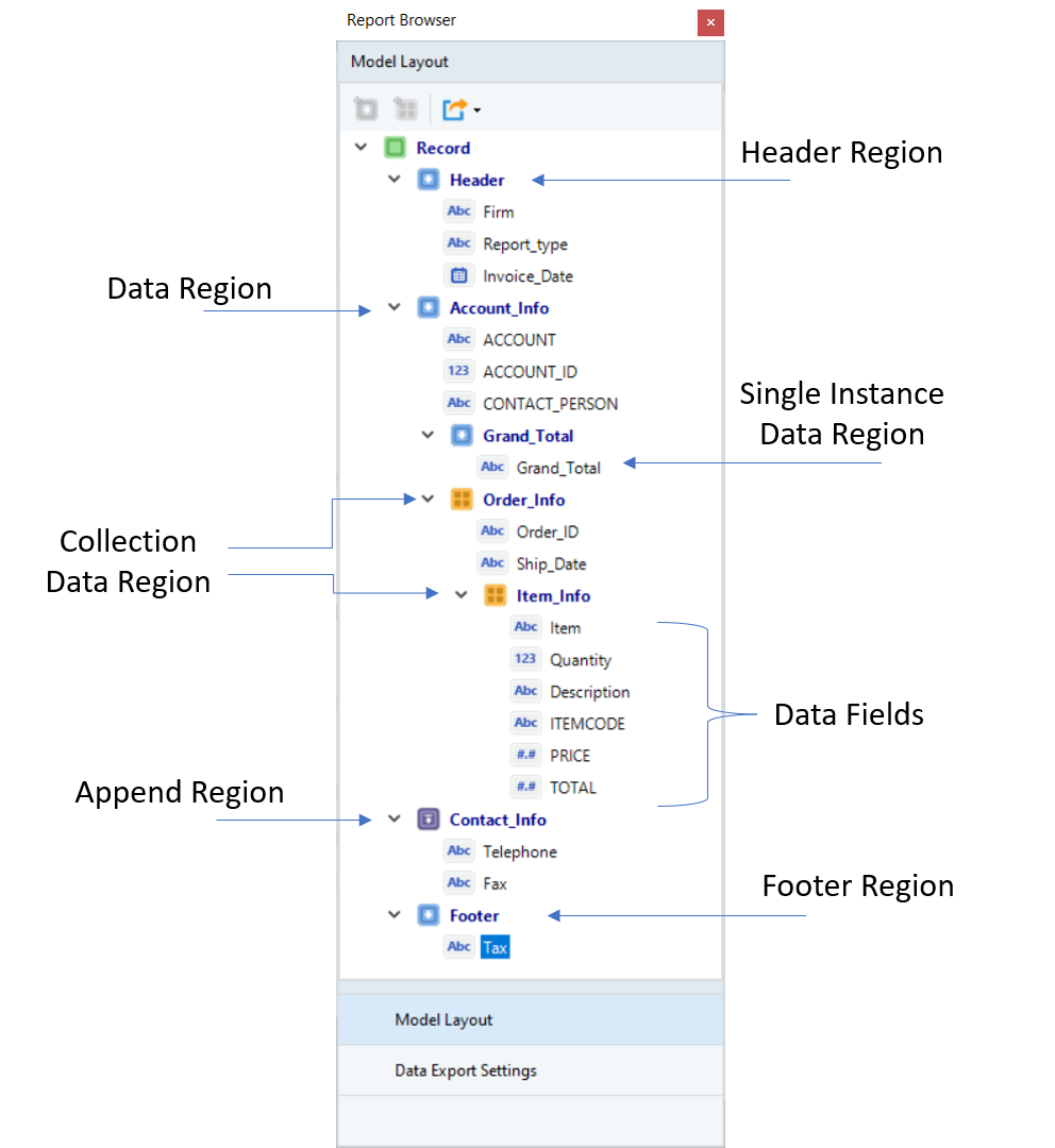 A report model comprises of seven main components that appear in the Model Layout tab as shown below: