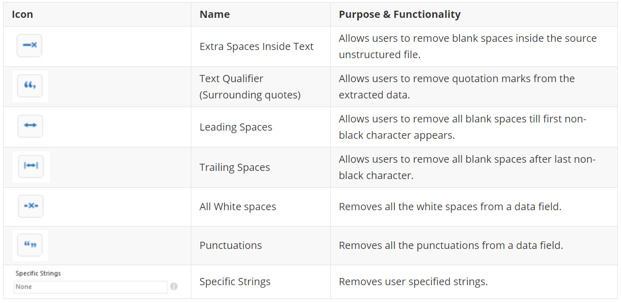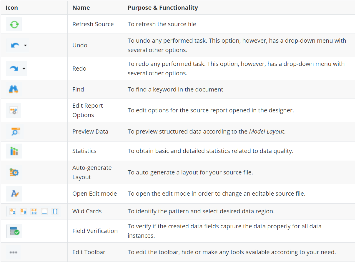 The toolbar has various options that facilitate the data extraction process. The purpose and functionality of the icons present in the toolbar are discussed below: