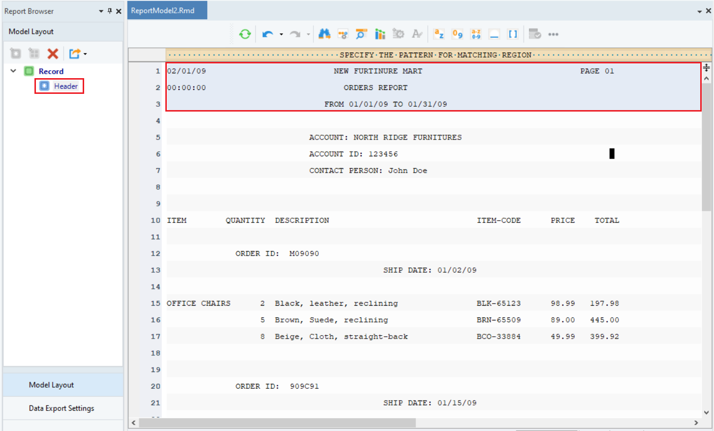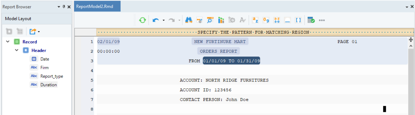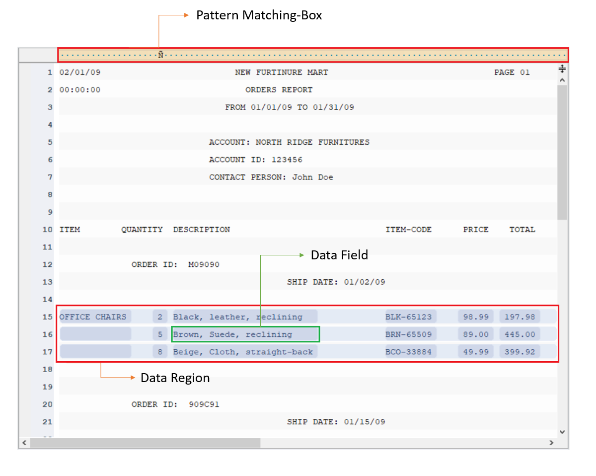 Astera extracts data based on the repeatedly appearing patterns in the source report. You have to identify and specify those repeating patterns in a report model to create data regions.