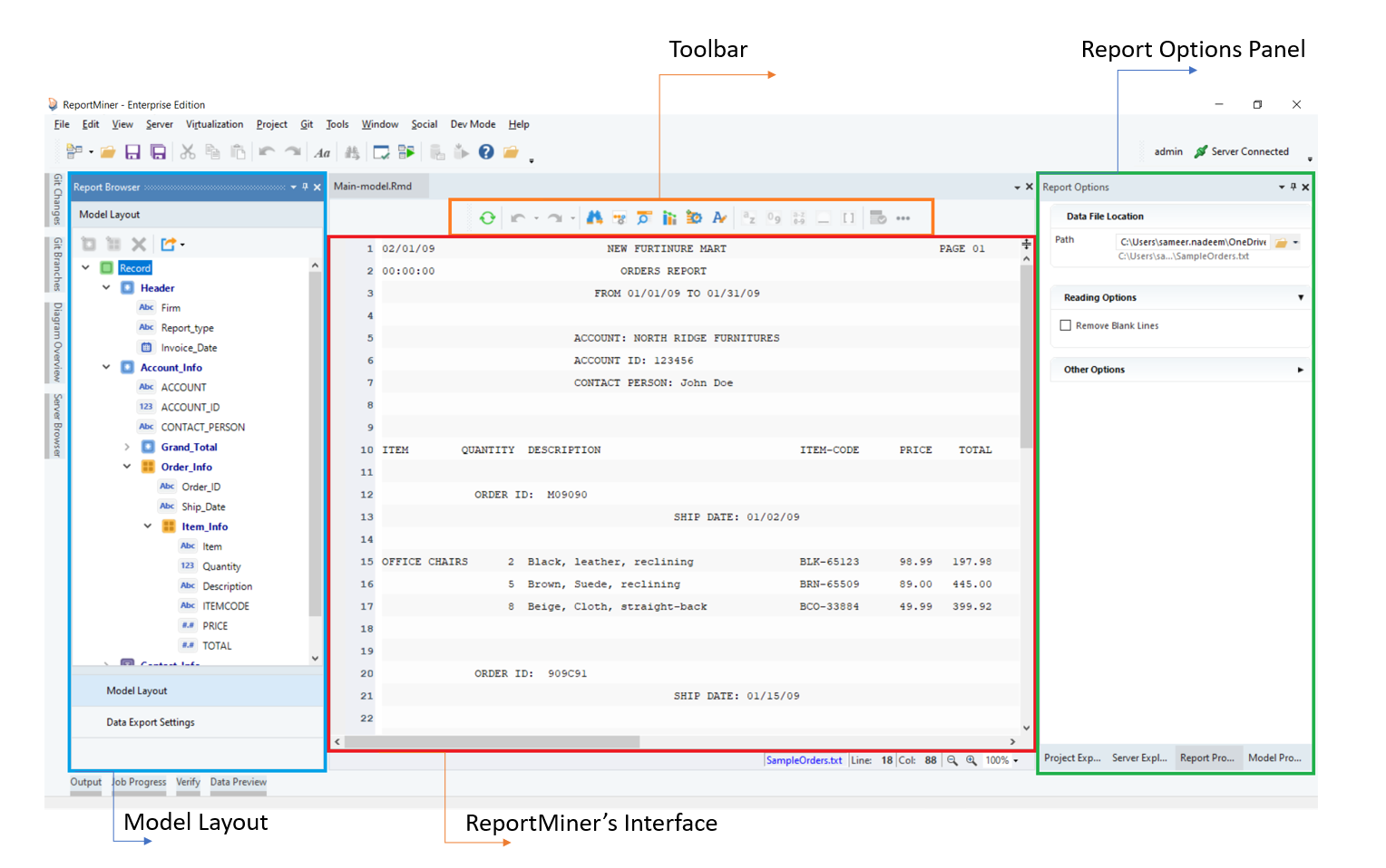 Astera's user-friendly interface enables business users to easily accomplish a wide range of data extraction tasks without relying on or employing expensive IT resources. With its easy-to-use, visual interface, the tool walks you through the process of identifying your desired data points, building the extraction logic, and sending it to the destination of your choice. The screenshot below displays important panels/windows in a Report Model.