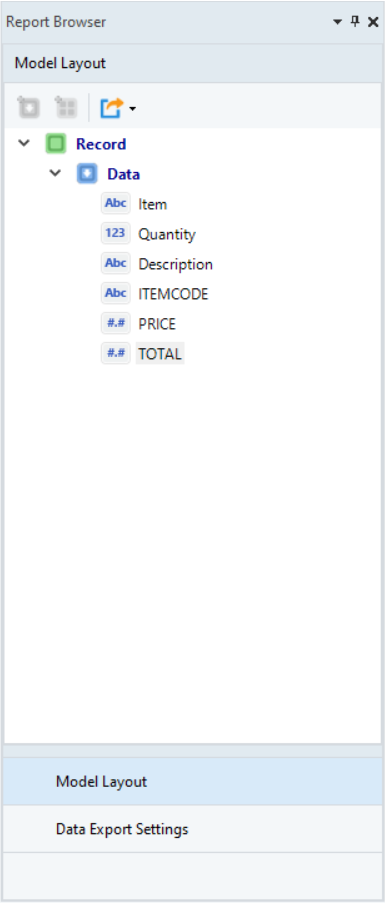 The Model Layout panel displays the layout of your report model or extraction template. It contains data regions and fields built according to a custom extraction logic.