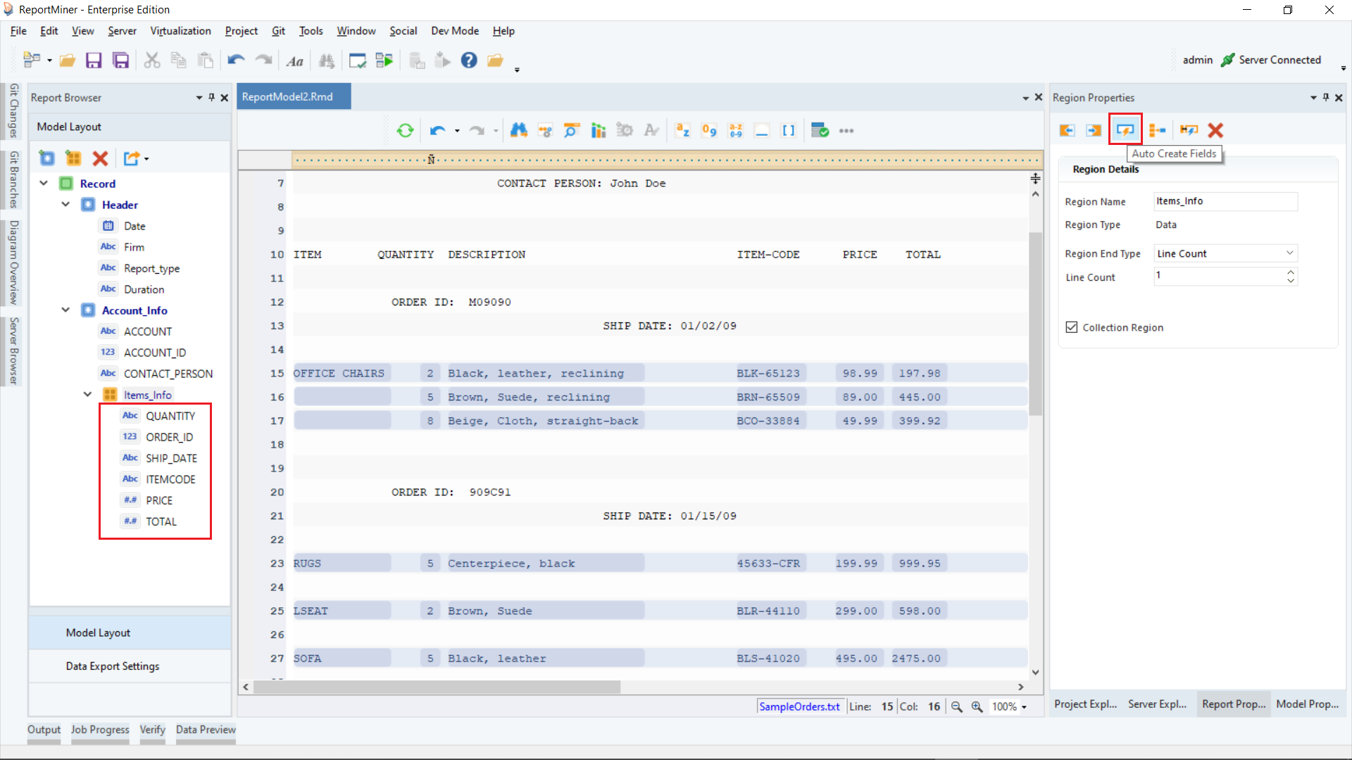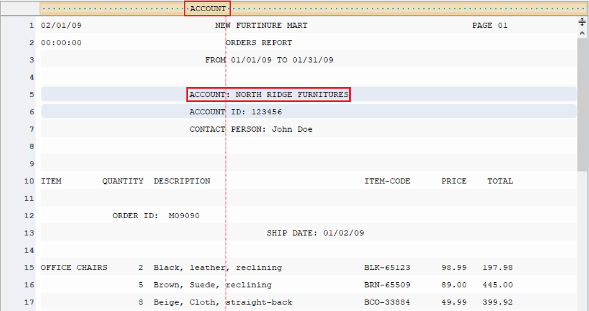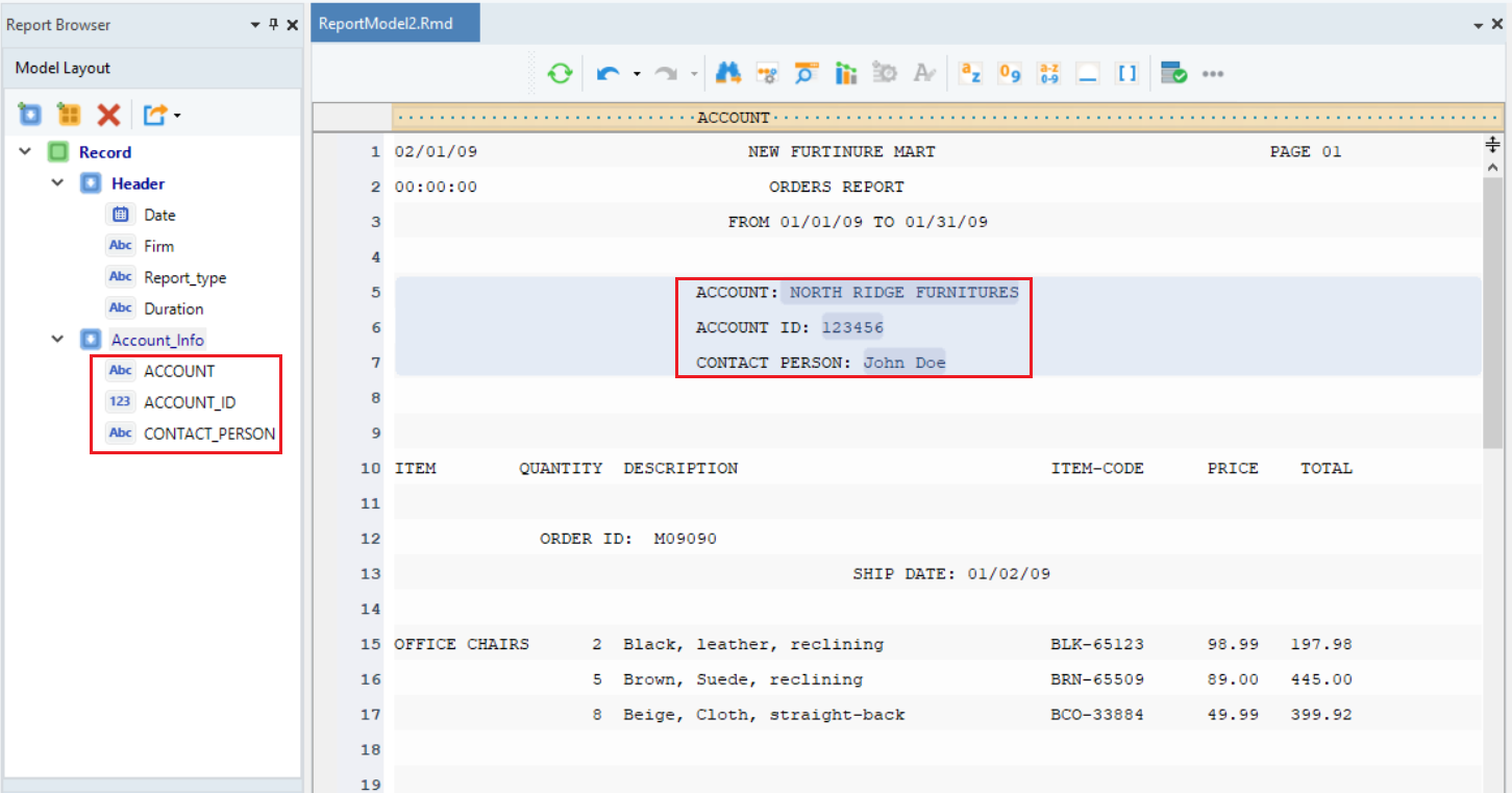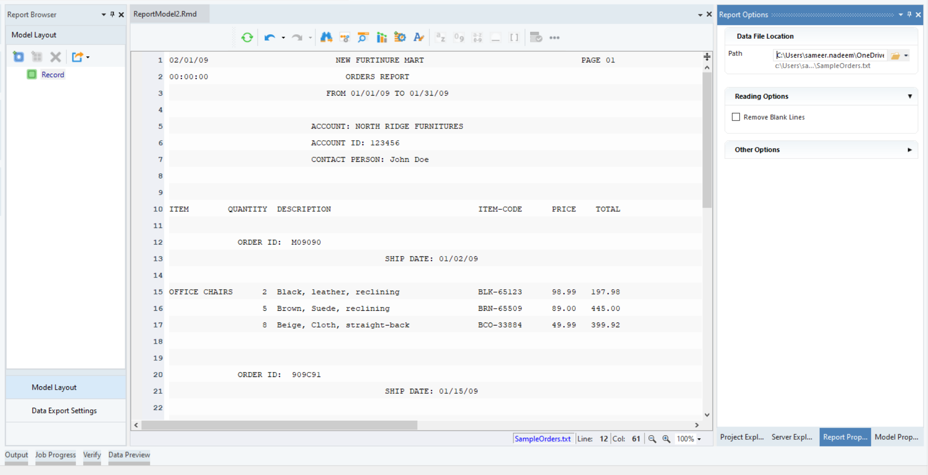 Click OK. The text file containing Orders invoice data will display on report model’s designer.