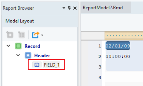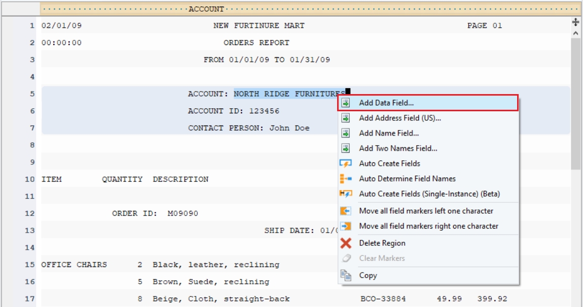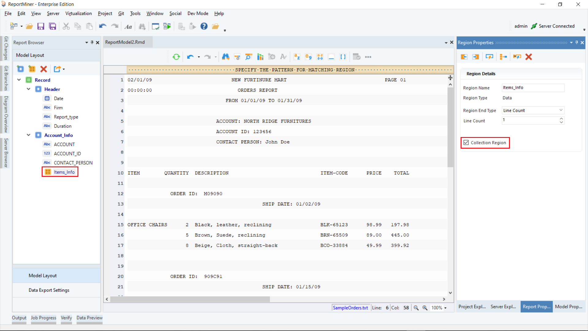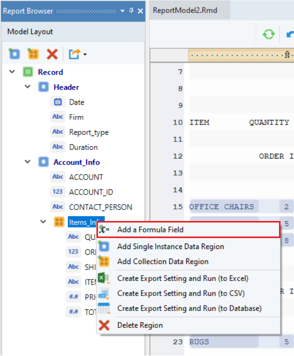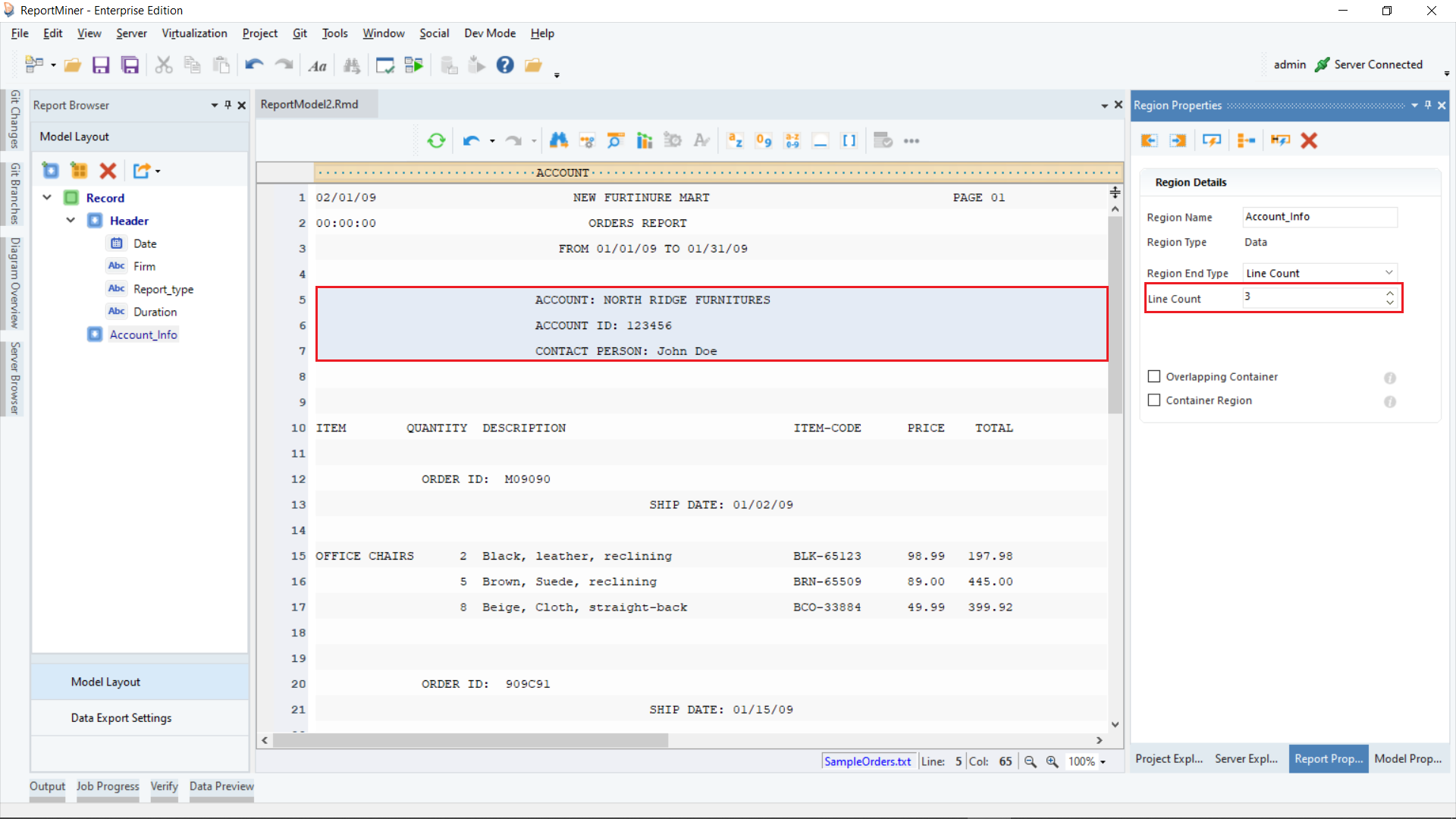 Click OK. The text file containing Orders invoice data will display on report model’s designer.