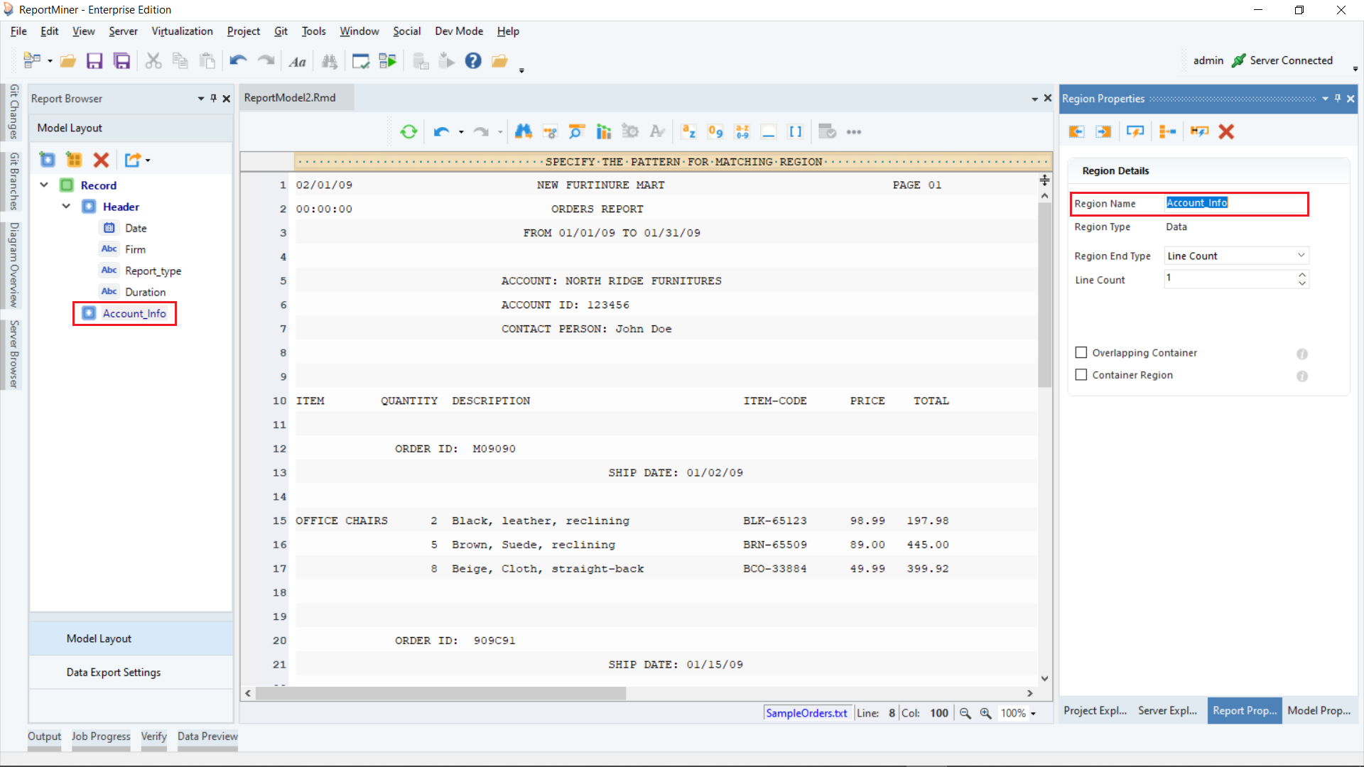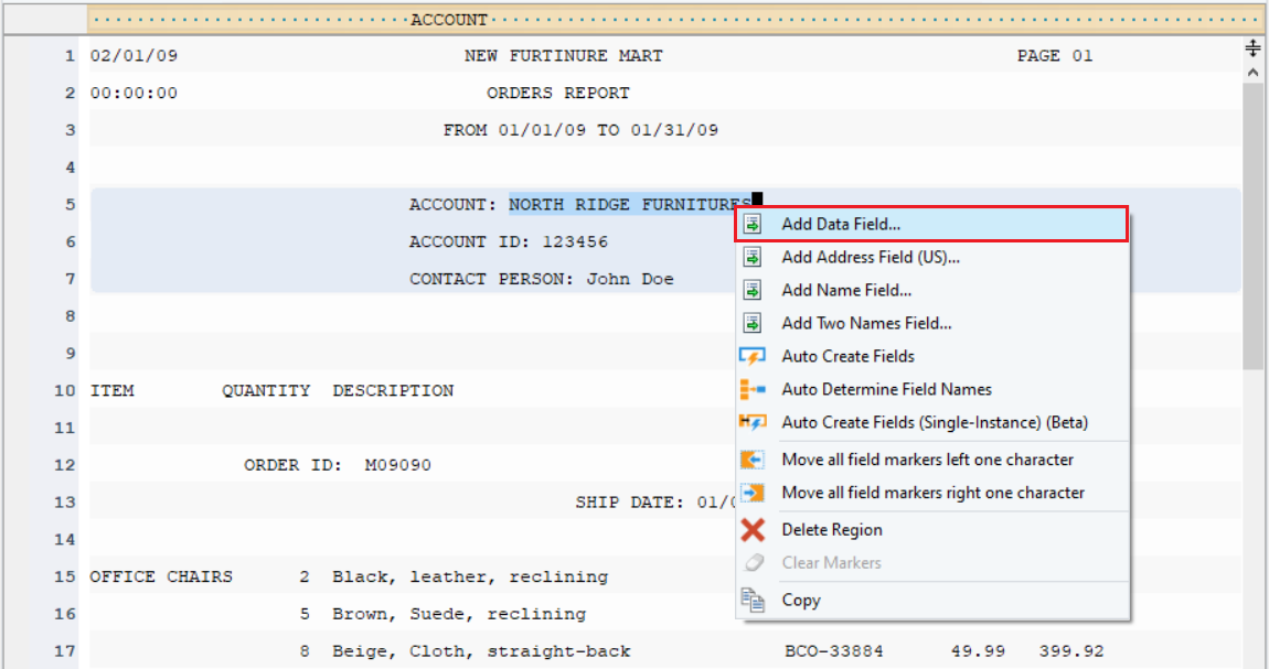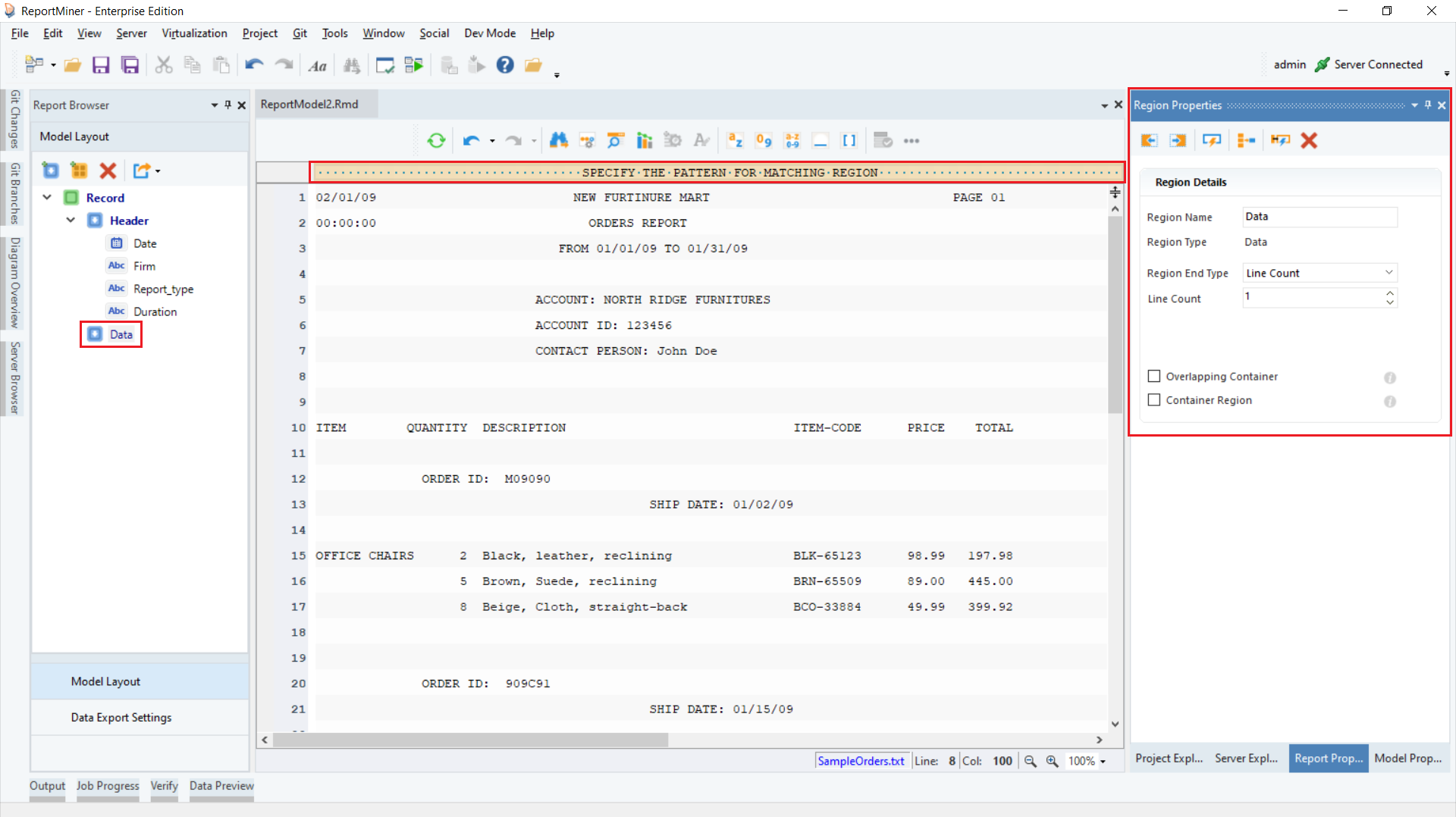 In this example, we are extracting Orders invoice data from a text file.