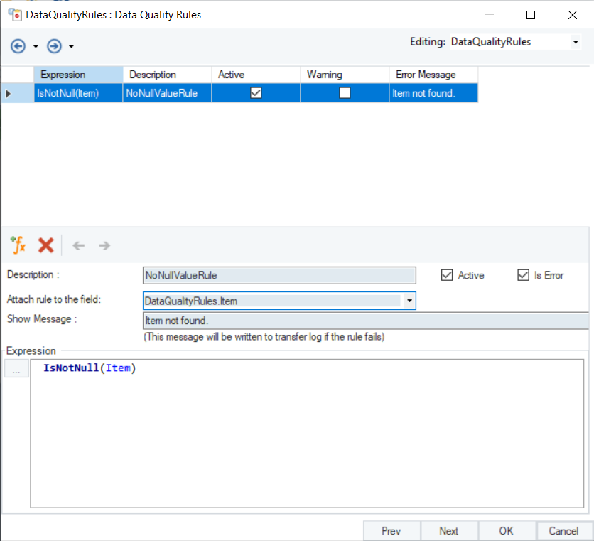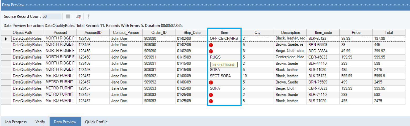 In this example, a Data Quality Rule is applied to identify null records in the Items field as errors with an error message: “Item not found”.