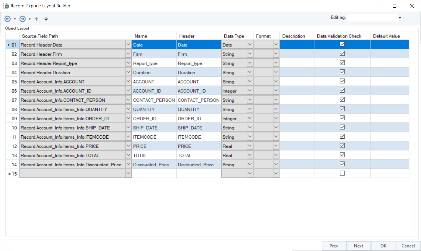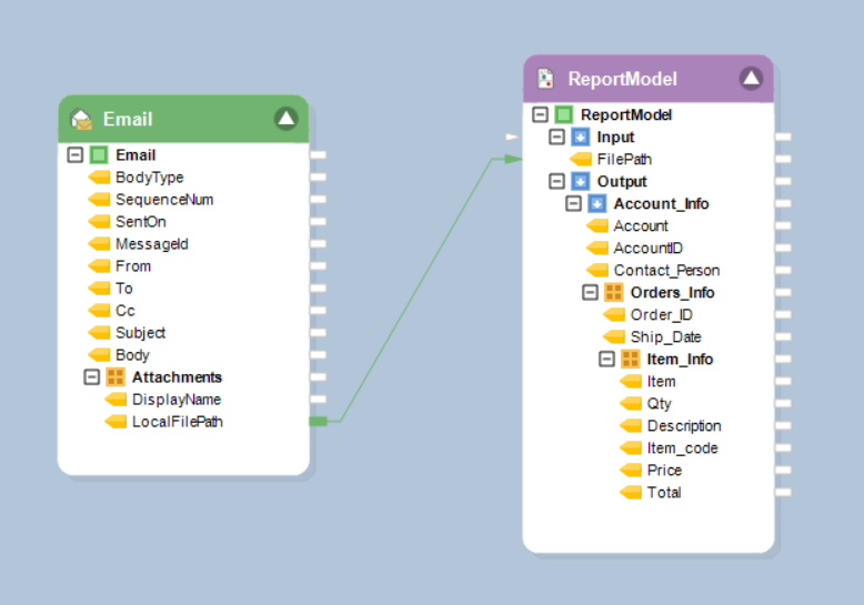 Once the source object has been configured, the Report Source object on the dataflow designer will show the fields with layout according to the report model you have created.