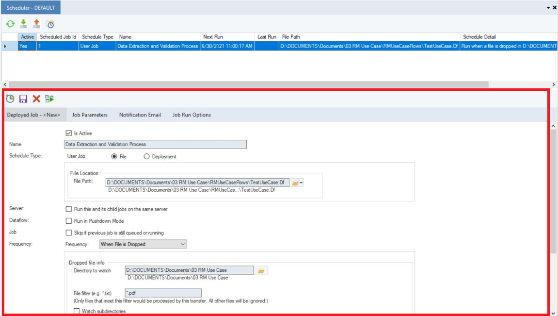 located above the Deployed Job tab to save this scheduled task. It will now be added to the list of active scheduled tasks. Now, upon arrival of every new unstructured file in the specified folder, the process of data extraction validation and conversion will be triggered.