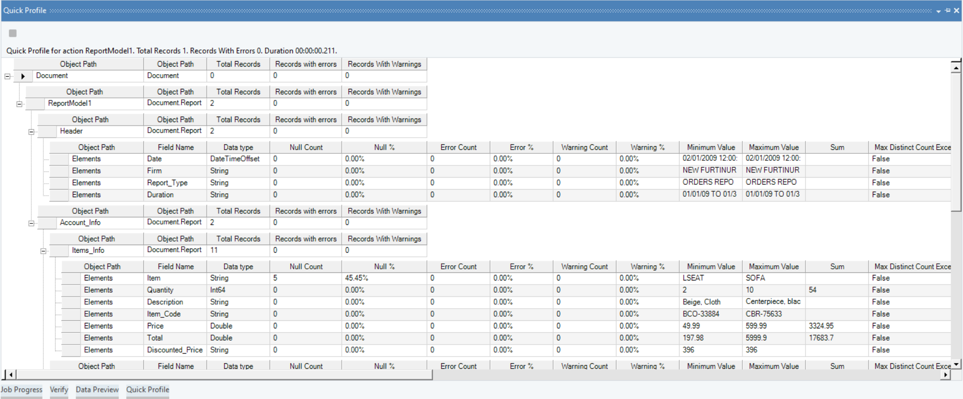 Once you have designed a report model, test it by previewing the data and collecting statistical information.