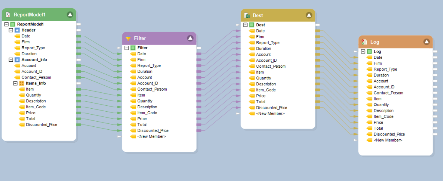 In this example, the dataflow that has been created contains a Report Source object, a Filter Transformation object (since we filtered out the exported data on the basis of Items), an Excel Workbook Destination object (for the Excel file we exported the data to), and a Record Level Log object.