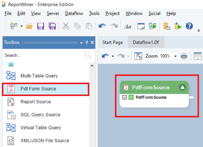 Drag-and-drop the PDF Form Source object onto the dataflow designer.