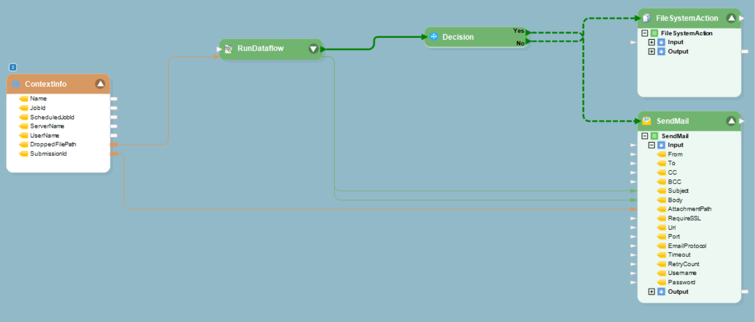 In this example, we will illustrate how to use the folder watching feature while designing a workflow. The screenshot below shows the workflow designer. In this example, we will deploy the same dataflow on every file that arrives in a folder and orchestrate it with a workflow.
