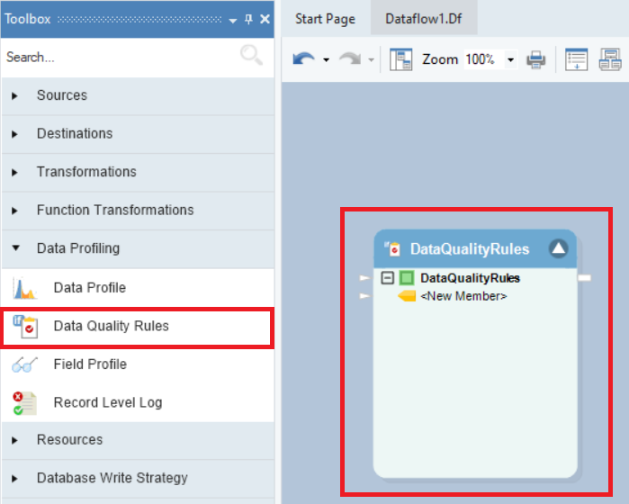To apply data quality rules, go to the data profiling section and drag and drop the Data Quality Rules object onto the dataflow designer.