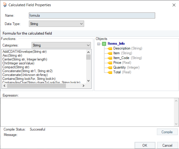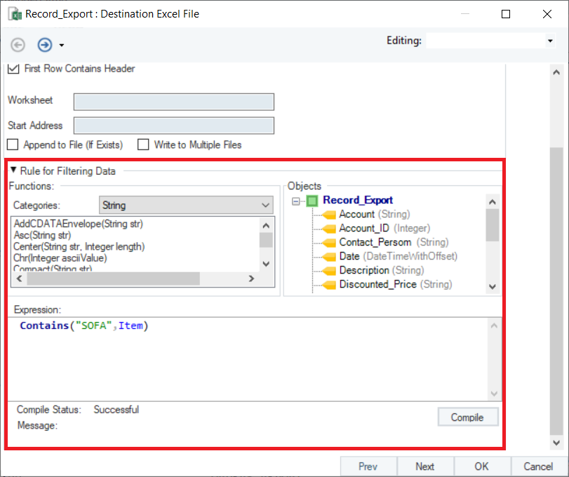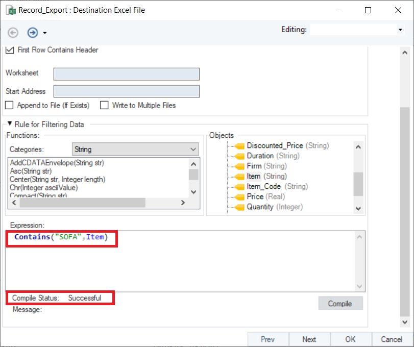 For this, we will write Contains(”SOFA”,Item) in the Expression builder. Click the Compile button to verify your expression.