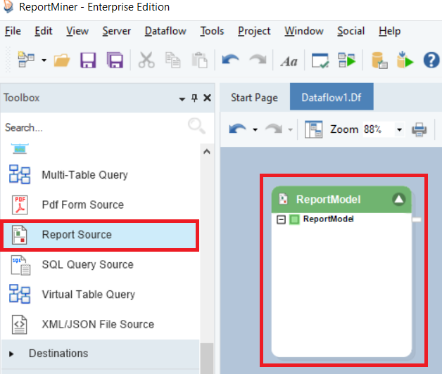 Expand the Sources section in the Toolbox, here you will find the Report Source object. Drag-and-drop the Report Source object onto the dataflow designer.