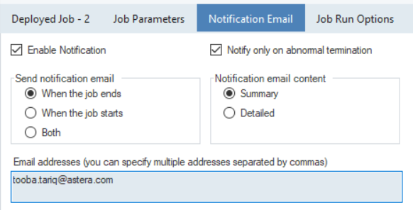 Users can also track the workflow’s progress with Astera's notification option. Emails can be configured to send alerts about instances such as the beginning of a task, abnormal terminations, completion of workflows, or errors.