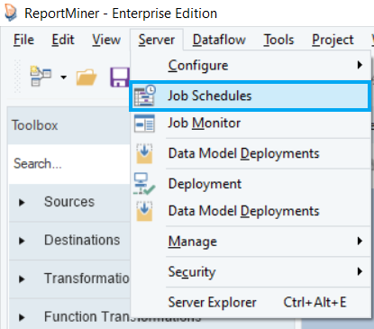 To open the Scheduler in Astera, go to Server > Job Schedules.