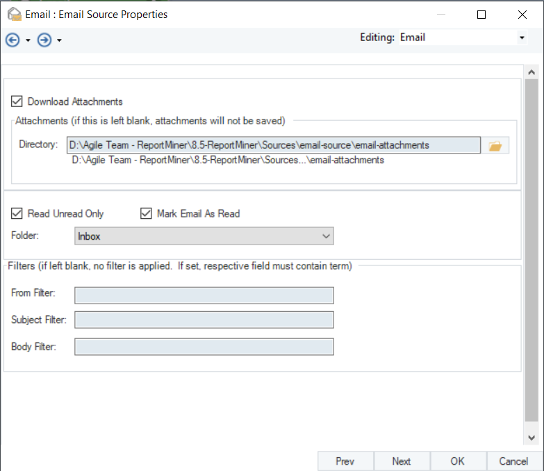 On the next screen, enable the Download Attachments option, specify the email folder for Astera to watch for incoming emails. You can also apply various filters to process only specific emails in the folder.