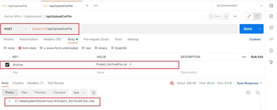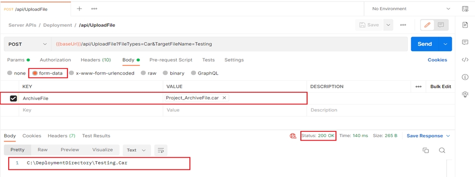 Next, we need to configure Request Body for this API. For the request body, select the form-data content type, select the Key type as File and provide the desired archive file (.car file) in the Value. Click Send.