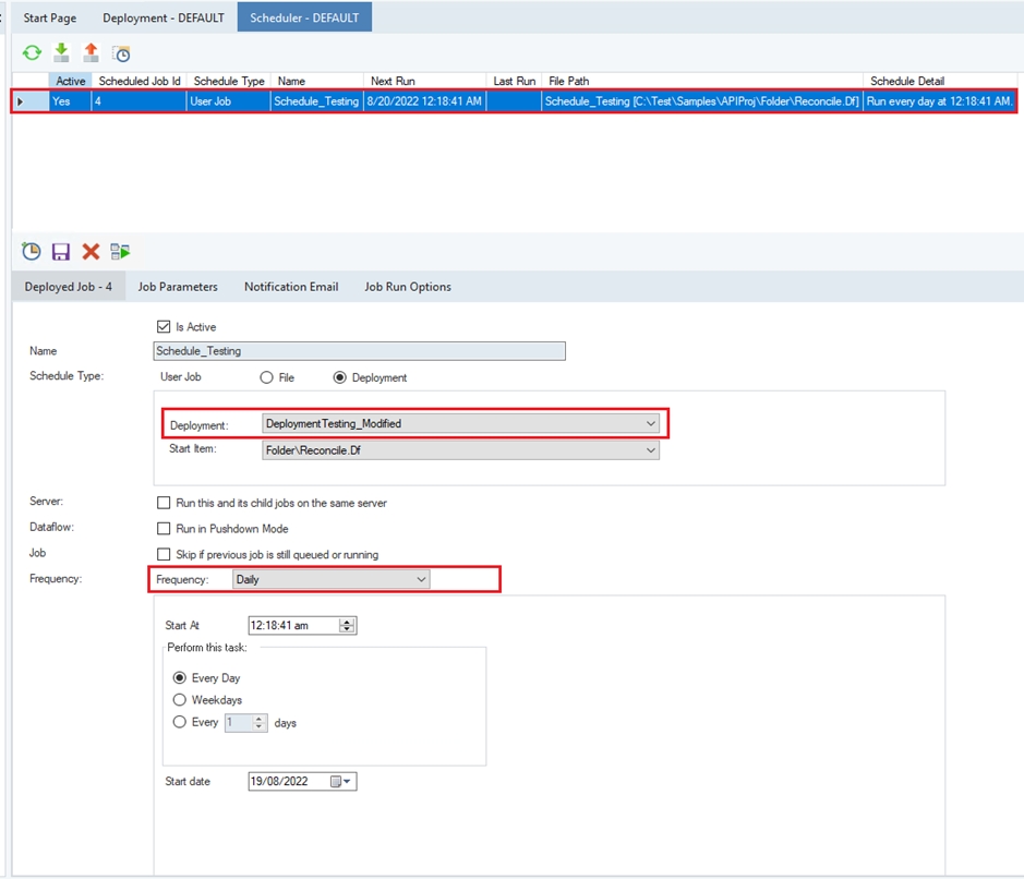 Let’s create the schedule called Schedule_Testing, which runs daily, with schedule type deployment, an active state as True, etc.
