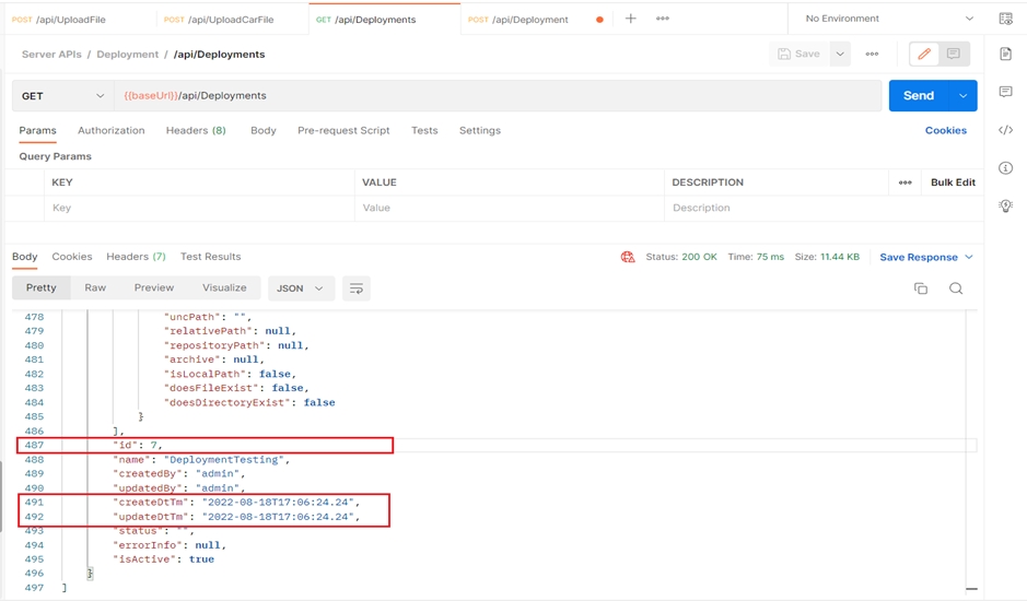 So, to gather the details, we firstly use the ‘GET api/Deployments’ API to fetch the info of the existing deployment. Then, we copy the deployment Id, UpdateDtTm, and CreatedDtTm fields from the response.