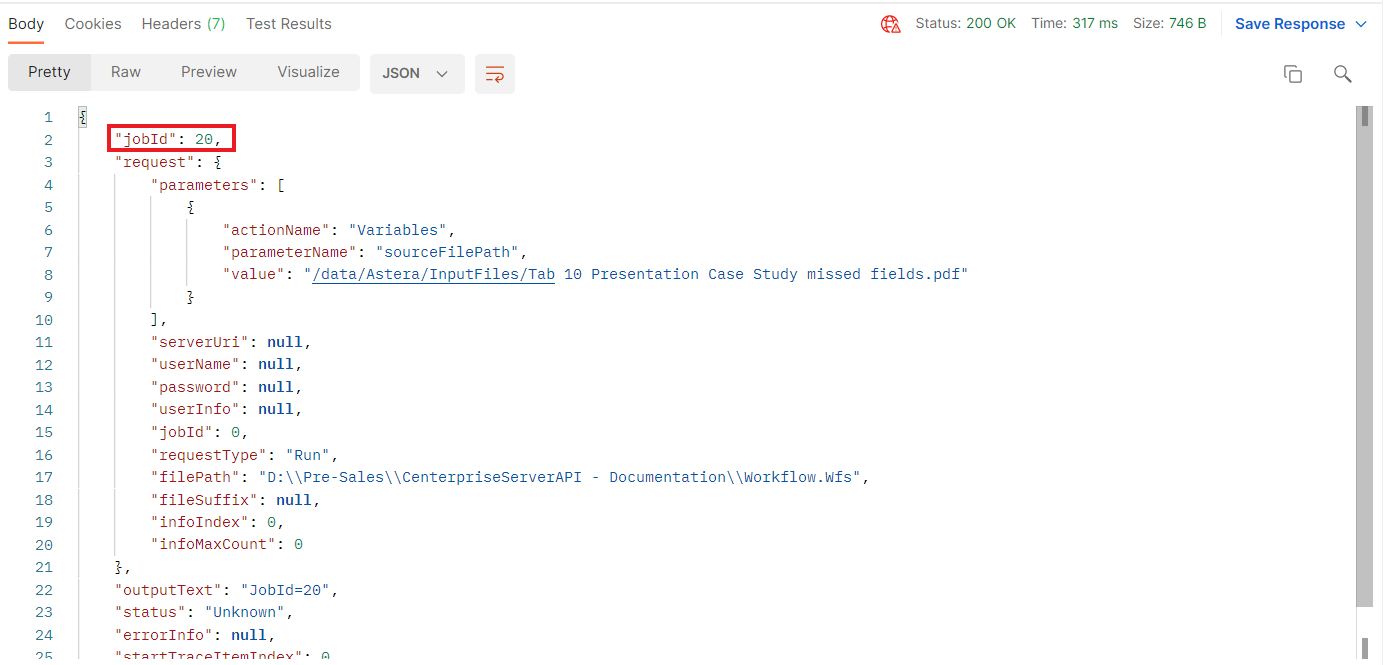 As soon as you send this API request, Astera will provide you with a jobID that you can use to get the job status.