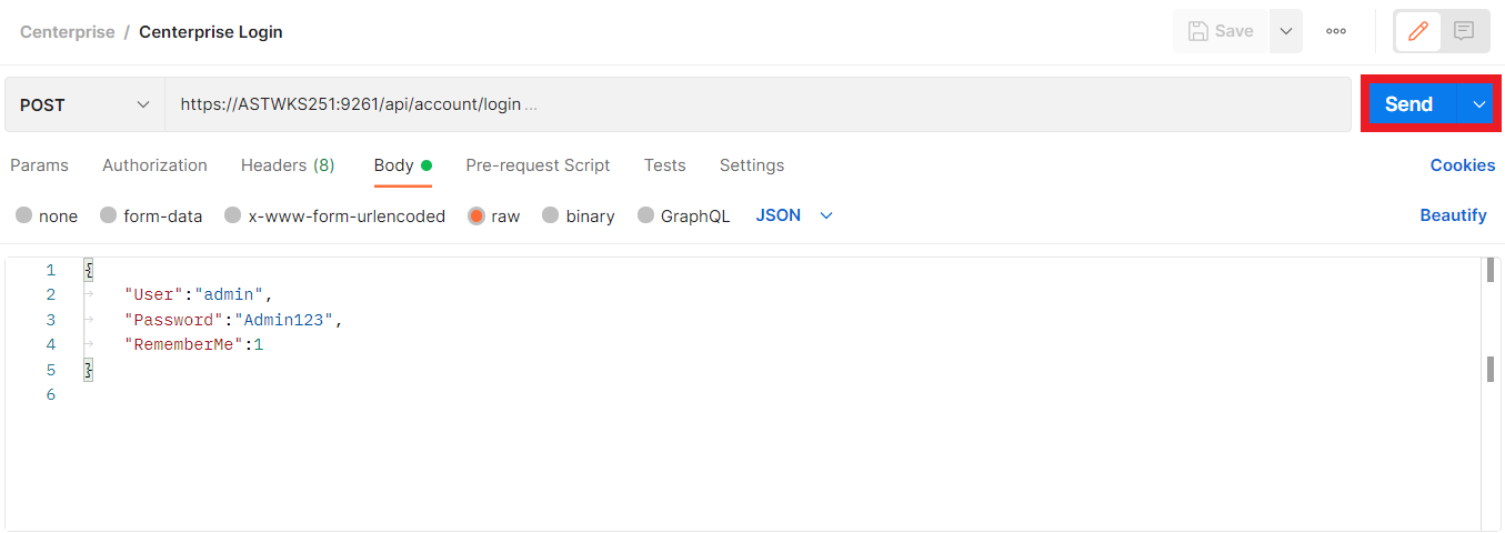 We will make the first API call for logging into the Astera server to generate an access token. Provide the following credentials in the request body and click on Send.