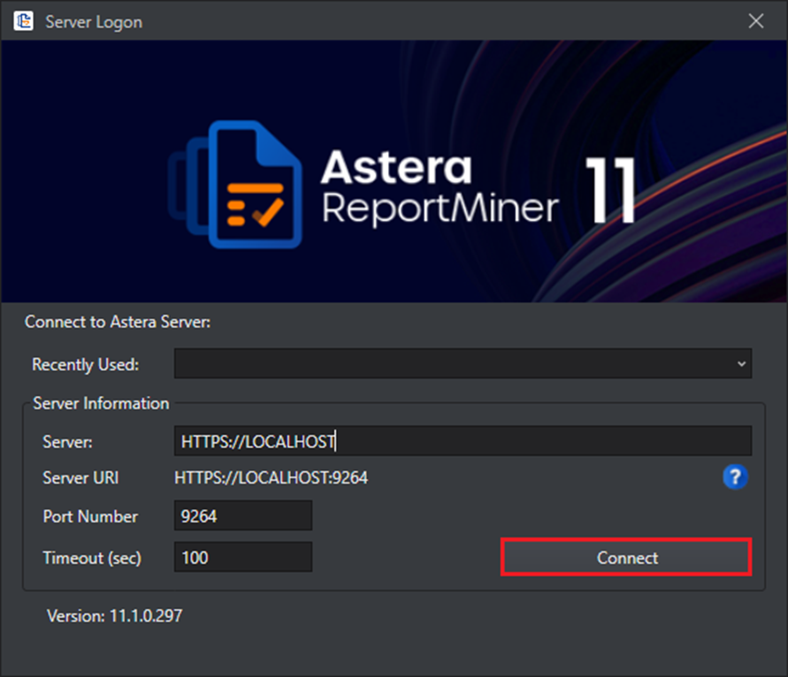 After you have successfully installed Astera client and server applications, open the client application and you will see the *Server Connection* screen as pictured below.