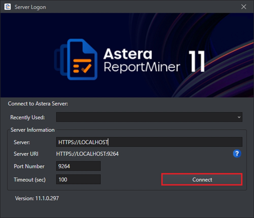 After you have successfully installed Astera client and server applications, open the client application and you will see the Server Connection screen as pictured below.