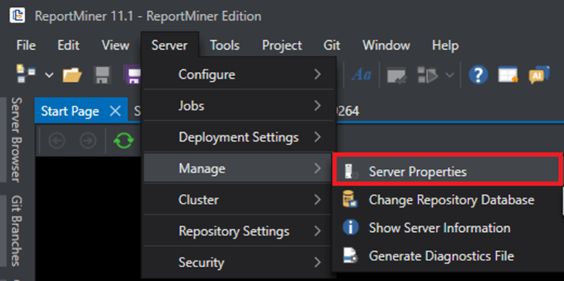 1. Launch the client and navigate to *Server > Manage > Server Properties*.