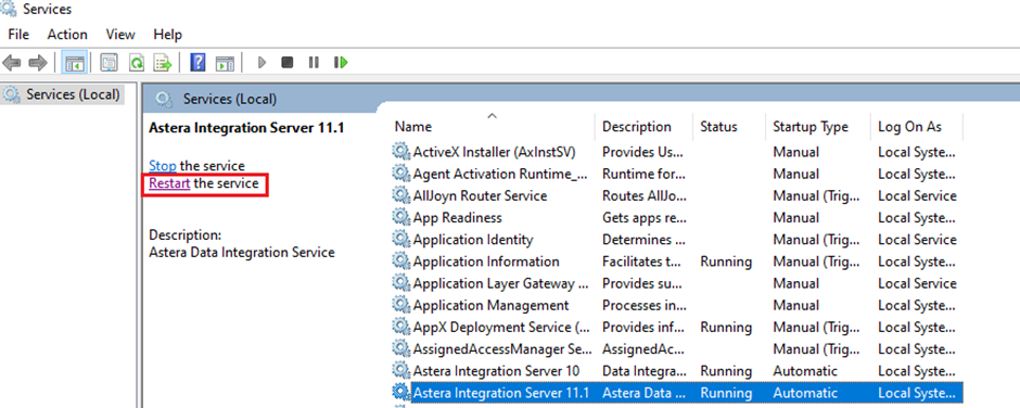 3. Now open the *Start Menu > Services* and restart the service of Astera Integration Server 11.1.