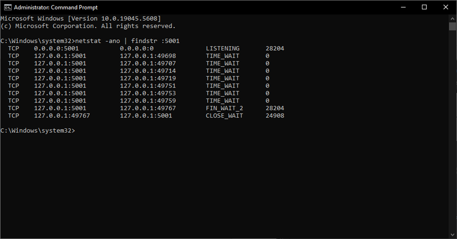 5. Typ&#x65;**`netstat -ano | findstr :5001`** command in the command prompt to check if your python server is running.