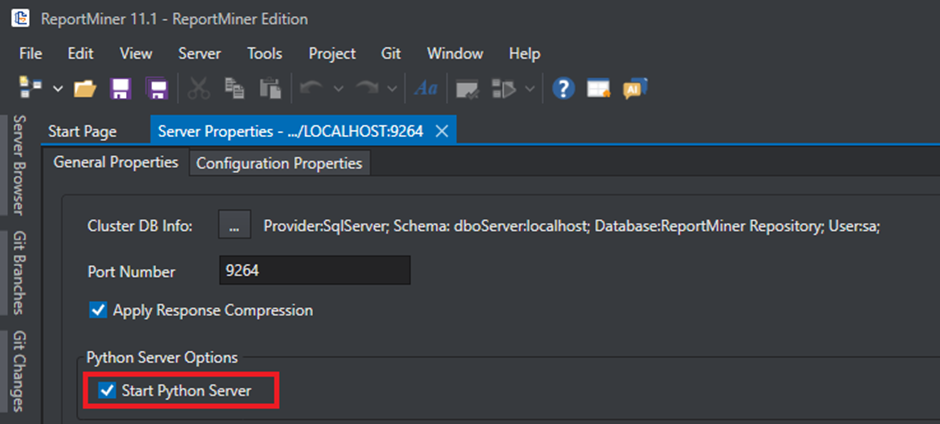 2. In the Server Properties, check the *Start Python Server* checkbo*x* and press *Ctrl + S* to save your changes.