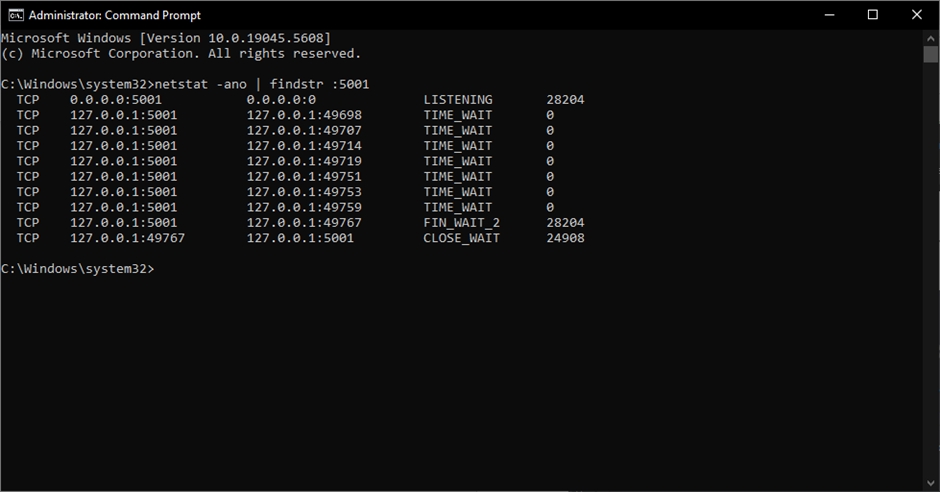 netstat -ano | findstr :5001command in the command prompt to check if your python server is running.