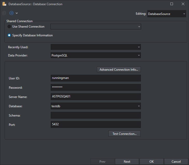 Select PostgreSQL from the Data Provider drop-down list and provide the credentials for establishing the connection.