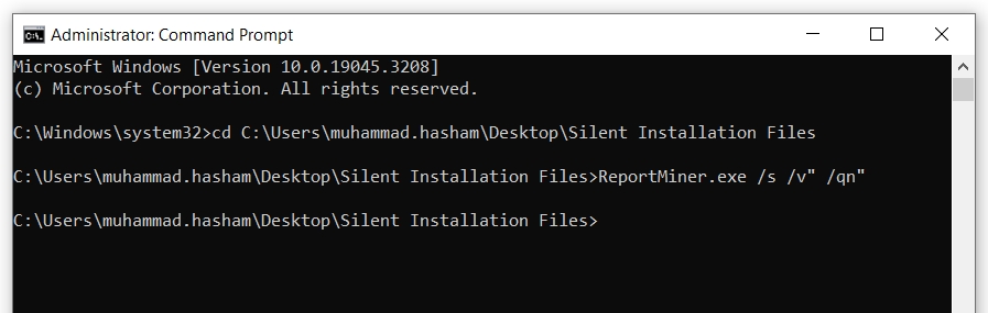 "ReportMiner.exe" /s /v" INSTALLDIR=“C:\Users\muhammad.hasham\Desktop\Silent Installation Files”/qn"Using MSI FILE general cmd:
