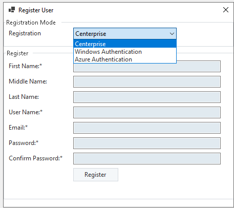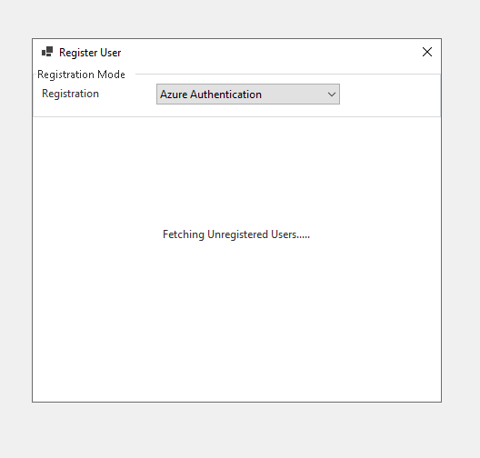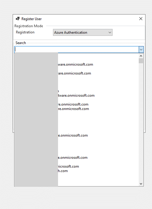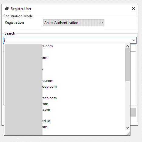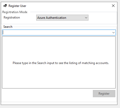 A Register User window will open, in the Registration drop-down select Azure Authentication