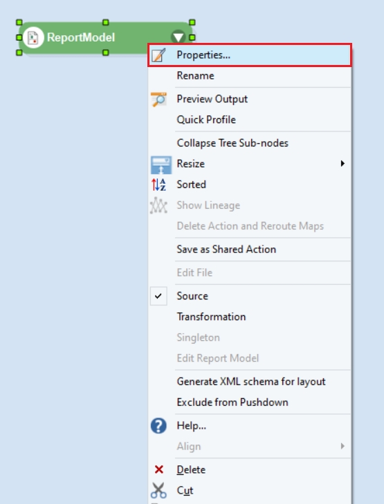 Drag-and-drop the Report Source object onto the dataflow designer from Toolbox > Sources > Report Source. Right-click on the object’s header and select Properties from the context menu.