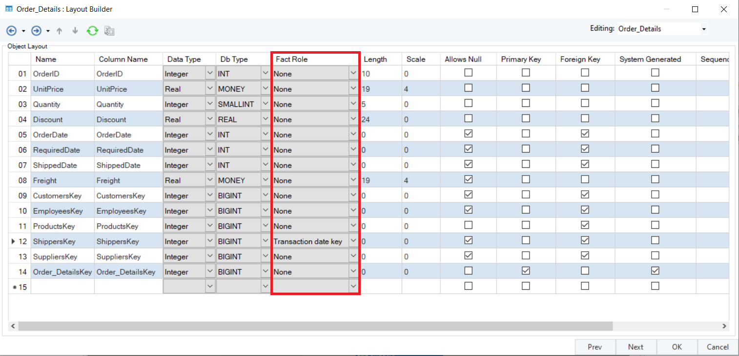 The fact entity’s Layout Builder contains a Fact Role column, through which you can assign the Transaction Date Key role to one of the fields.
