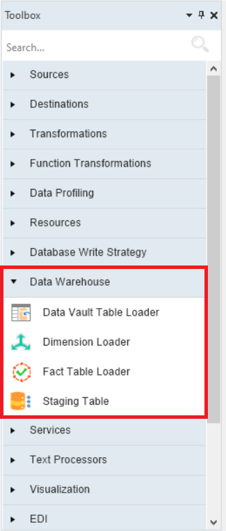 Once you’ve added a new dataflow to the data warehousing project, you can use the extensive set of objects available in the dataflow toolbox to design an ETL process. The Fact Loader and Dimension Loader objects can be used to load data into fact and dimension tables, respectively.