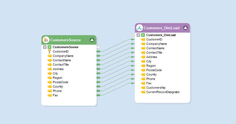 On the left, we’ve used a Database Table Source object to fetch data from a table present in the source data model. On the right, we’ve used the Dimension Loader object to load data into a table present in the destination dimensional model.