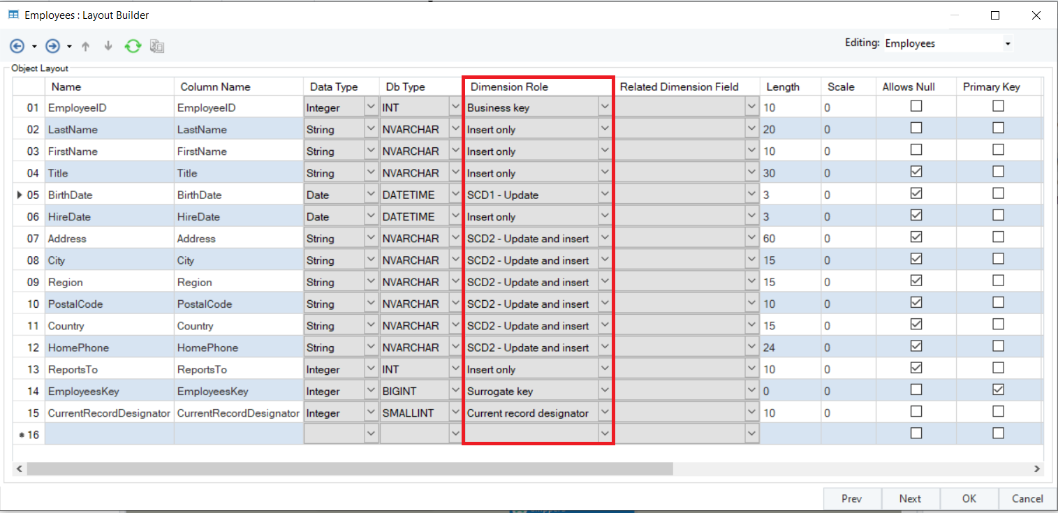 As an example, here is the layout of the Employee entity in the dimensional model after we’ve assigned dimension roles to its fields.