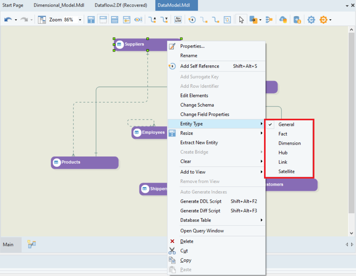 Next, we’ll convert this model into a dimensional model by assigning facts and dimensions. The type for each entity, when a database is reverse engineered, is set as General by default. You can conveniently change the type to Fact or Dimension by right-clicking on the entity, hovering over Entity Type in the context menu, and selecting an appropriate type from the given options.