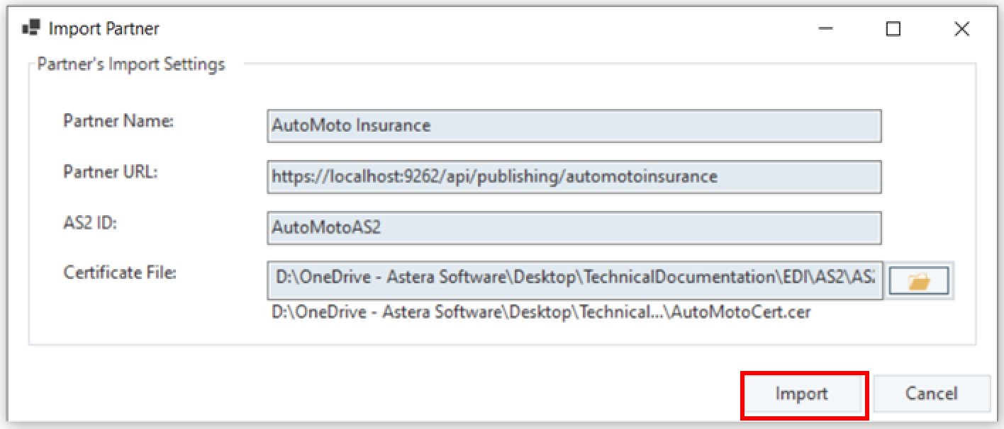 Now, let’s add our AS2 partner and click Import.