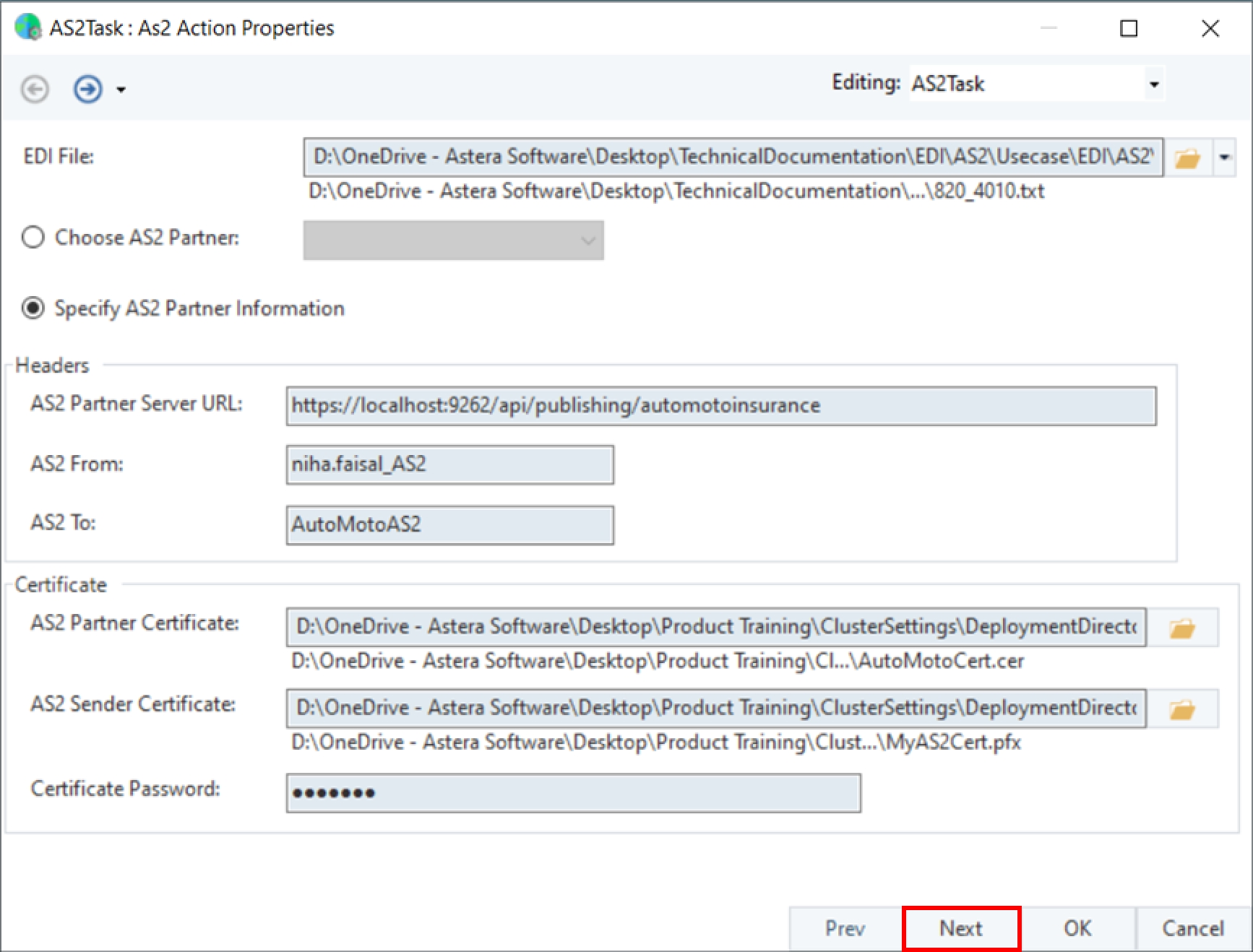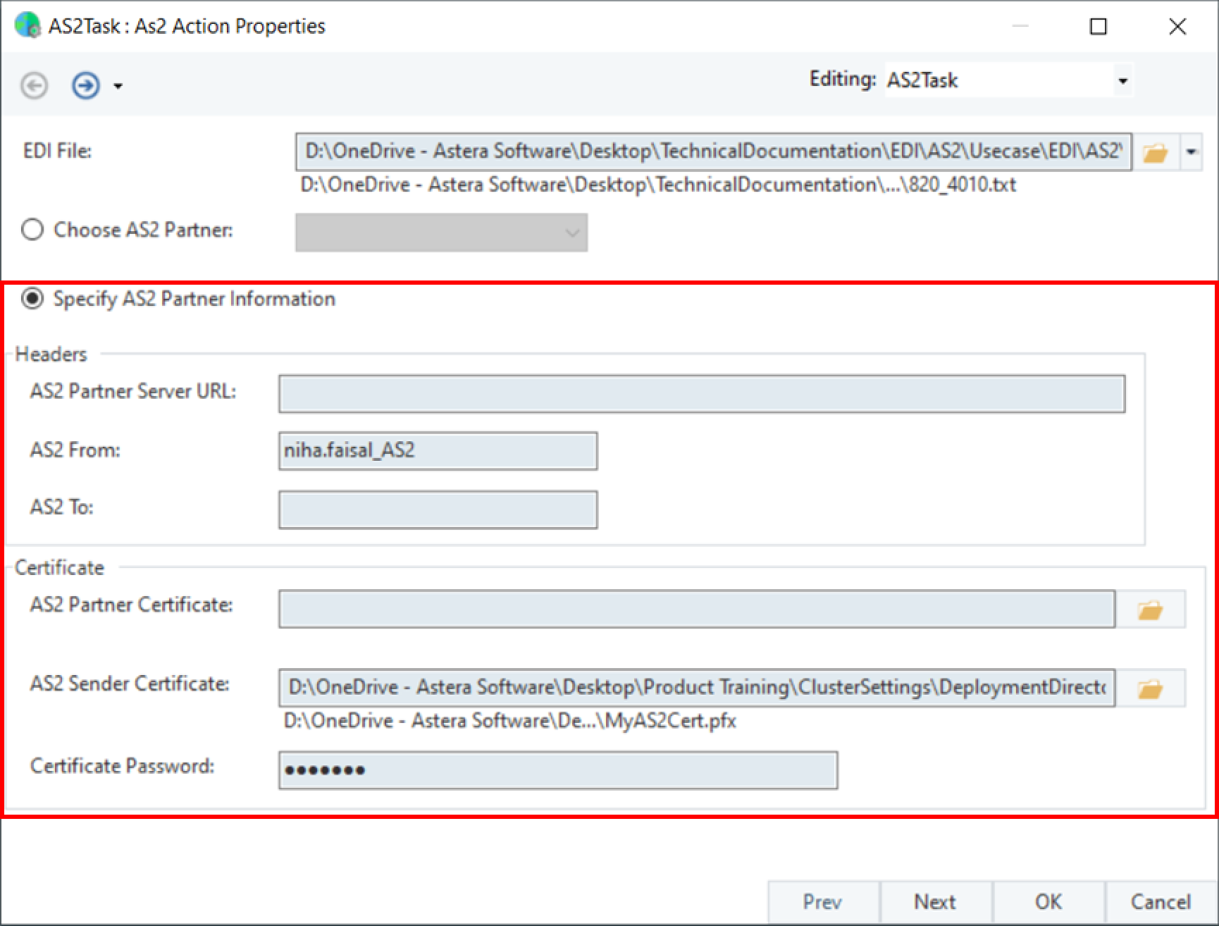 AS2 Sender Certificate and Password – File path where your private certificate is stored along with its password.
