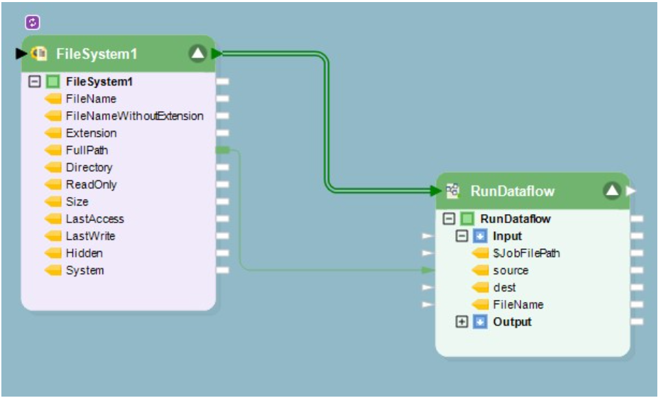 The Input port on an object allows you to connect it to an upstream object on the workflow. Conversely, the Output port allows you to connect your object to a downstream object on the workflow. The downstream object representing a task will be processed after the upstream object it is connected to has finished running (with some exceptions, such as the *Run Program* task, which may not require waiting for the program to exit).